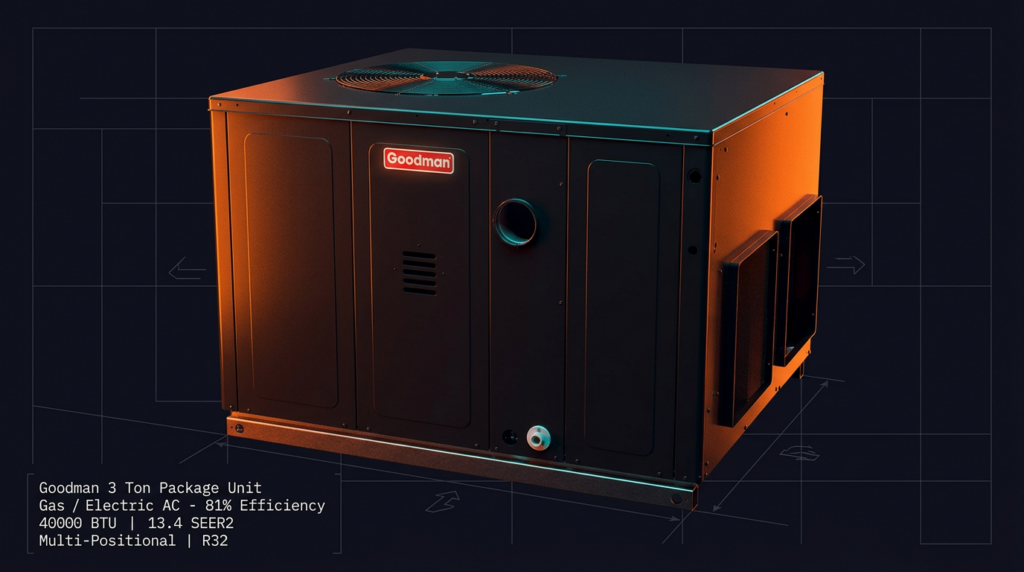 The Goodman 3 Ton Package Unit Gas/Electric AC delivers reliable heating and cooling in a single integrated unit. This multi-positional system is designed for homeowners and contractors who need efficient climate control without separate indoor and outdoor components. With 13.4 SEER2 efficiency and R32 refrigerant, this unit meets current energy standards while reducing operational costs.