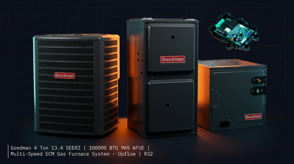 The Goodman 4 Ton 13.4 SEER2 Multi-Speed ECM Gas Furnace System delivers efficient heating and cooling in an upflow configuration using R32 refrigerant. This complete system pairs a high-efficiency gas furnace with a matching condenser and evaporator coil, making it ideal for homeowners seeking reliable performance with lower operating costs. The 96% AFUE furnace and 13.4 SEER2 rating provide significant energy savings compared to older equipment.