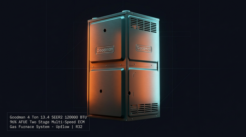The Goodman 4 Ton 13.4 SEER2 120000 BTU 96% AFUE Two Stage Multi-Speed ECM Gas Furnace System delivers high-efficiency heating and cooling for residential properties. This R32 system combines a variable-speed ECM blower motor with a two-stage gas valve and silicon nitride igniter for reliable, quiet operation. It’s designed for homeowners and contractors seeking energy-efficient performance with low NOx emissions.