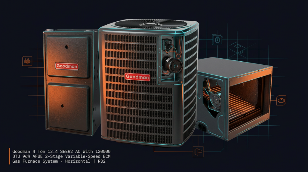 The Goodman 4 Ton 13.4 SEER2 AC with 120,000 BTU 96% AFUE 2-Stage Variable-Speed ECM Gas Furnace System is a complete heating and cooling solution designed for residential applications requiring efficient year-round comfort. This R32 system pairs a high-efficiency air conditioner with a two-stage gas furnace to deliver both reliable performance and lower operating costs. It’s ideal for homeowners and contractors seeking AHRI-certified equipment with advanced controls and proven Goodman reliability.