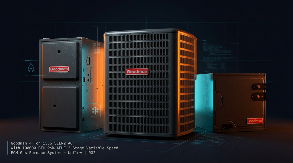 The Goodman 4 Ton 13.5 SEER2 AC with 100,000 BTU 96% AFUE 2-Stage Gas Furnace System delivers efficient heating and cooling for residential upflow installations. This R32 refrigerant unit pairs a high-efficiency air conditioner with a variable-speed ECM furnace, making it suitable for homeowners seeking lower energy bills without replacing their existing ductwork. The 10-year parts warranty and factory-charged condenser provide peace of mind and reduce installation complexity.