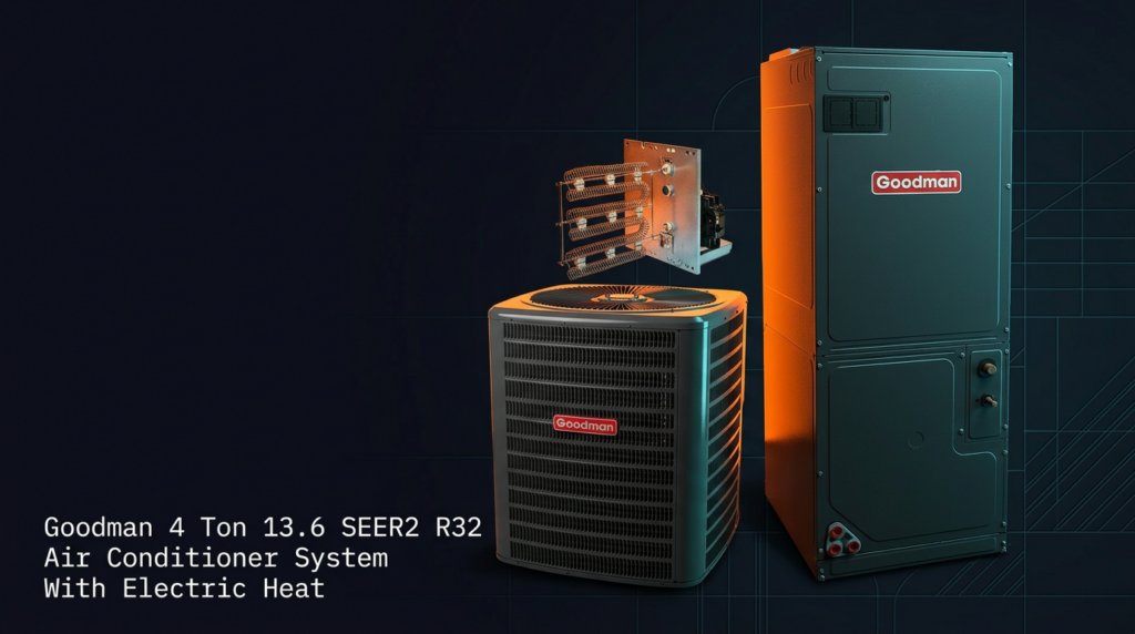 The Goodman 4 Ton 13.6 SEER2 R32 Air Conditioner System with Electric Heat is a complete cooling and heating solution for residential applications. This system pairs the GLXS3B condenser with the AMST48CU1300 air handler and includes an electric heat kit, delivering efficient climate control in a single package. The R32 refrigerant and high SEER2 rating make this an energy-efficient choice for homeowners looking to reduce utility costs.