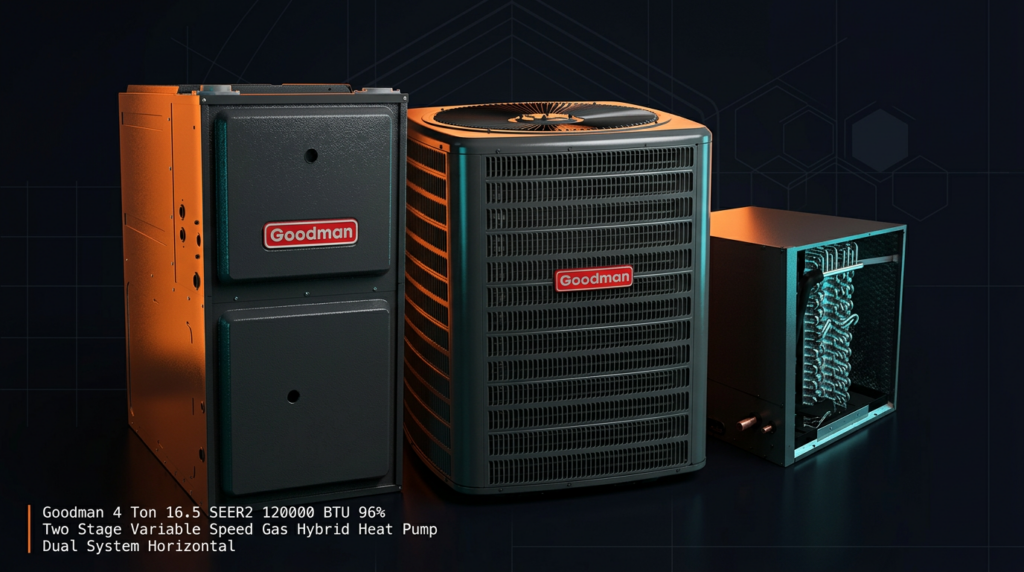 The Goodman 4 Ton 16.5 SEER2 Two Stage Variable Speed Gas Hybrid Heat Pump Dual System combines a high-efficiency heat pump condenser with a 96% AFUE gas furnace for year-round comfort in cold climates. This hybrid system switches between heat pump and gas heating to optimize efficiency and reduce operating costs. Designed for homeowners seeking superior efficiency and contractors needing reliable, communicating equipment.