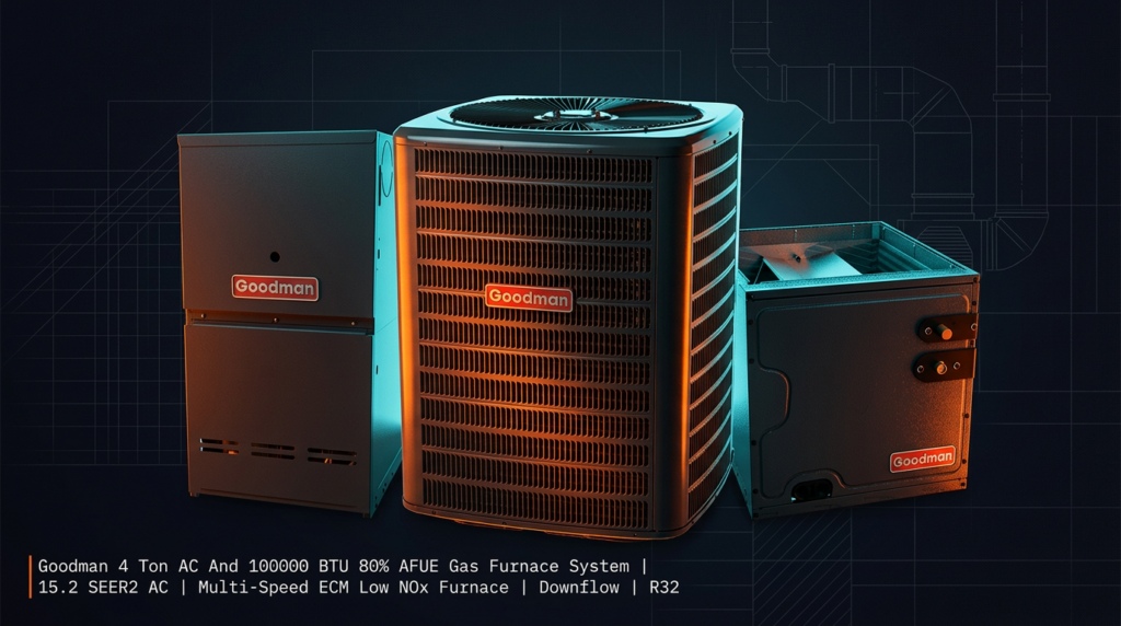 The Goodman 4 Ton AC and 100,000 BTU 80% AFUE Gas Furnace System delivers efficient heating and cooling in a downflow configuration. This R32-ready combo unit features a 15.2 SEER2 air conditioner paired with a multi-speed ECM low NOx furnace, making it suitable for homeowners seeking reliable climate control with reduced emissions. The system arrives fully charged and ready for installation with minimal field setup.
