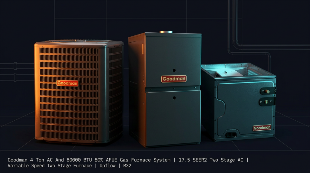The Goodman 4 Ton AC and 80,000 BTU 80% AFUE Gas Furnace System delivers two-stage cooling and heating in a single matched package. This system pairs a 17.5 SEER2 R32 air conditioner with a variable-speed two-stage furnace, making it ideal for homeowners seeking reliable comfort and measurable energy savings. The upflow configuration and ComfortBridge technology integration provide smart diagnostics and consistent performance.