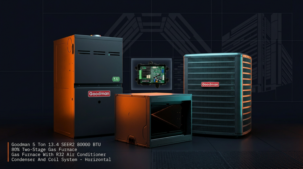 The Goodman 5 Ton 13.4 SEER2 Two-Stage Gas Furnace with R32 Air Conditioner System delivers efficient heating and cooling for residential applications. This horizontal unit combines a reliable gas furnace with an R32 condenser and coil, making it suitable for homeowners seeking energy-efficient climate control. The two-stage design provides quiet, economical operation while maintaining consistent comfort throughout the home.