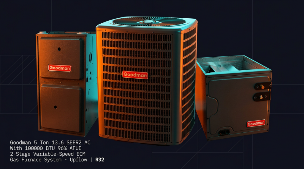 The Goodman 5 Ton 13.6 SEER2 AC with 100,000 BTU 96% AFUE 2-Stage Variable-Speed ECM Gas Furnace System delivers efficient cooling and heating in a single upflow configuration using R32 refrigerant. This system is ideal for homeowners and contractors seeking AHRI-certified equipment with integrated smart home connectivity and two-stage heating for improved comfort and energy savings.