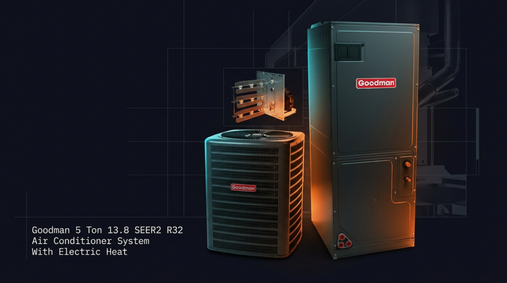 The Goodman 5 Ton 13.8 SEER2 R32 Air Conditioner System With Electric Heat delivers high-efficiency cooling and reliable heating for residential applications. This unit pairs the GLXS3B R32 condenser with an AMST air handler and electric heating element, offering modern refrigerant technology with strong seasonal efficiency ratings. It’s built for homeowners and contractors seeking an energy-efficient system at a competitive price point.