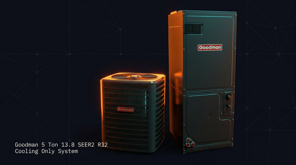 The Goodman 5 Ton 13.8 SEER2 R32 Cooling Only System is a high-efficiency air conditioning unit designed for residential applications requiring robust cooling performance and energy savings. This system pairs the GLXS3BN6010 condenser with the AMST60DU1300 air handler to deliver reliable cooling with R32 refrigerant optimization. It is ideal for homeowners and contractors seeking an AHRI-certified cooling solution with extended equipment lifespan and minimal installation complexity.