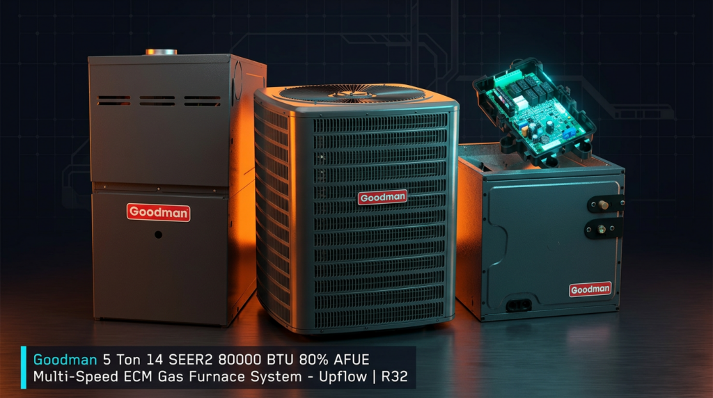 The Goodman 5 Ton 14 SEER2 80% AFUE Multi-Speed ECM Gas Furnace System delivers efficient heating and cooling for residential applications. This upflow R32 system combines a high-efficiency air conditioner with a gas furnace featuring a multi-speed ECM blower motor. It’s designed for homeowners seeking dependable performance with moderate efficiency ratings and easy installation options.