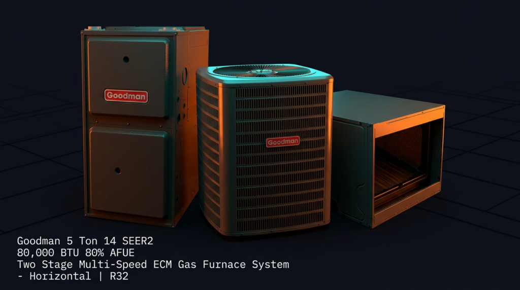 The Goodman 5 Ton 14 SEER2 80% AFUE Two Stage Multi-Speed ECM Gas Furnace System delivers efficient heating and cooling for residential applications using R32 refrigerant. This horizontal configuration suits homes where space is limited, and the system is designed for professionals and homeowners seeking reliable performance with reduced operating costs. The two-stage gas valve and multi-speed ECM motor provide economical operation across varying heating demands.