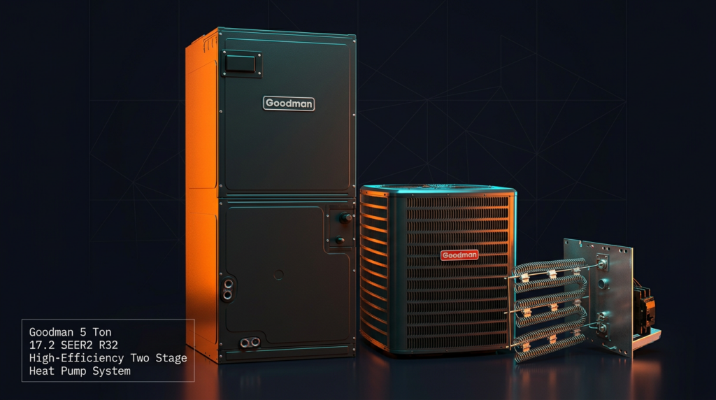 The Goodman 5 Ton 17.2 SEER2 R32 High-Efficiency Two Stage Heat Pump System delivers reliable heating and cooling for residential applications with advanced efficiency and smart home integration. This system combines a two-stage scroll compressor with variable-speed components to optimize performance across multiple operating conditions. Ideal for contractors and homeowners seeking dependable equipment with modern diagnostic capabilities, this heat pump provides consistent comfort year-round.