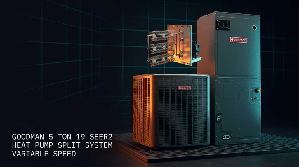 The Goodman 5 Ton 19 SEER2 Heat Pump Split System with Variable Speed delivers efficient heating and cooling for residential applications. This inverter-driven system combines the GSZV9 condenser with the AMVE air handler to provide reliable performance and advanced controls. The variable-speed compressor and ECM blower motor automatically adjust to match your home’s heating and cooling demands, reducing energy waste.