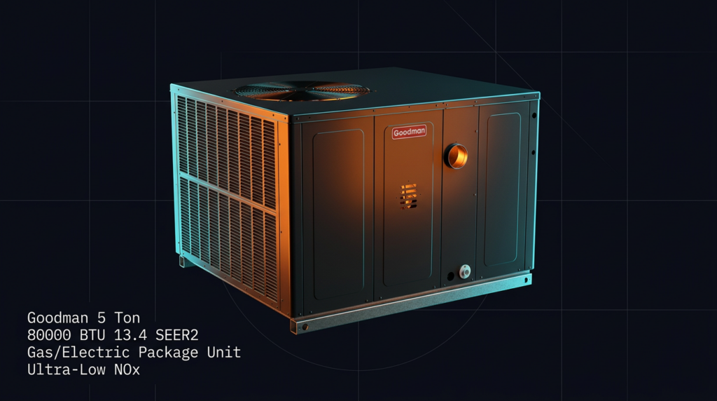The Goodman 5 Ton 80000 BTU 13.4 SEER2 Gas/Electric Package Unit (Model GPUM36108041) combines heating and cooling in a single rooftop or ground-level installation. Designed for contractors and property owners needing efficient all-in-one HVAC coverage, this unit delivers 80,000 BTU heating output with ultra-low NOx emissions compliance and a 13.4 SEER2 cooling rating.