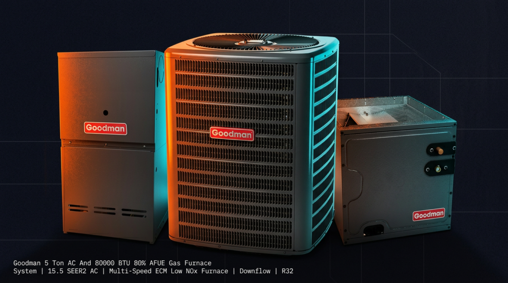The Goodman 5 Ton AC and 80,000 BTU 80% AFUE Gas Furnace System combines a high-efficiency scroll compressor condenser with a multi-speed ECM low NOx furnace for complete home comfort. This R32 refrigerant system delivers 15.5 SEER2 cooling performance and is ideal for homeowners seeking reliable, efficient heating and cooling in a single packaged solution.