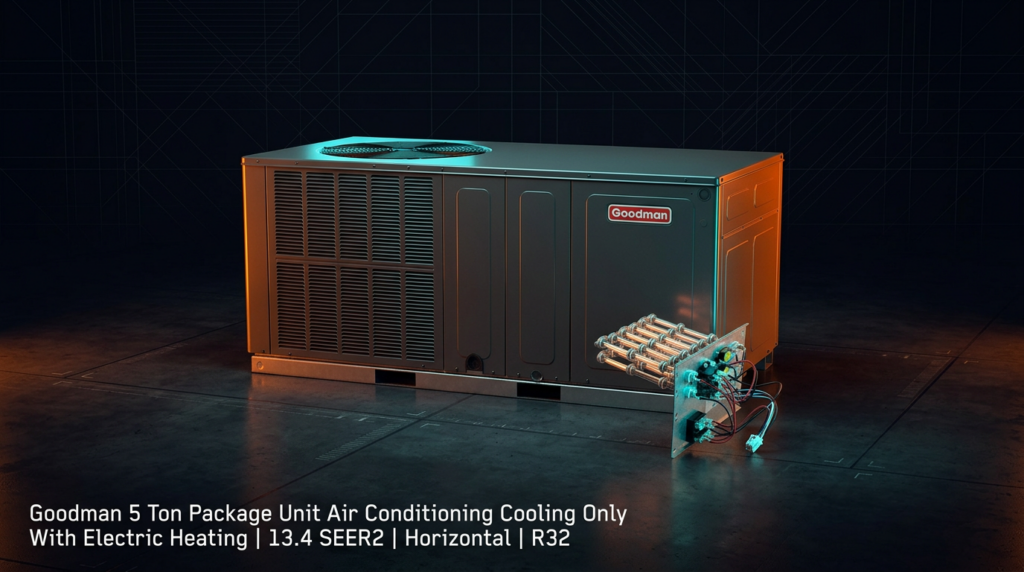 The Goodman 5 Ton Package Unit (Model GPCH36031) delivers efficient cooling-only air conditioning in a horizontal configuration, ideal for installations where ductwork runs through attics or crawl spaces. This unit operates at 13.4 SEER2 using R32 refrigerant and can be upgraded with optional electric heating elements for year-round climate control.