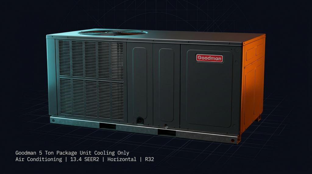 The Goodman 5 Ton Package Unit Cooling Only Air Conditioning (Model GPCH36031) is a horizontal-mount, R32 refrigerant system designed for new construction and replacement applications where cooling-only capacity is needed. This unit delivers efficient cooling performance at 13.4 SEER2, making it suitable for residential and light commercial properties requiring reliable air conditioning without heating functionality.