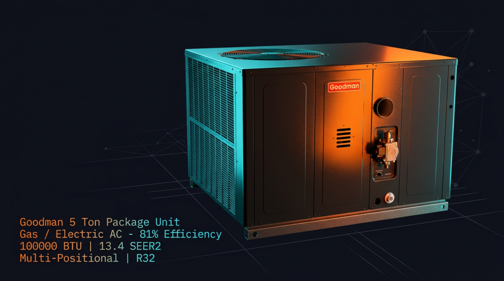 The Goodman 5 Ton Package Unit Gas/Electric AC delivers 100,000 BTU heating capacity with 13.4 SEER2 cooling efficiency in a single multi-positional unit. This R32-based system operates at 81% efficiency and is designed for residential applications where space and installation simplicity are priorities. Package units eliminate the need for separate indoor and outdoor components, reducing installation time and refrigerant line requirements.