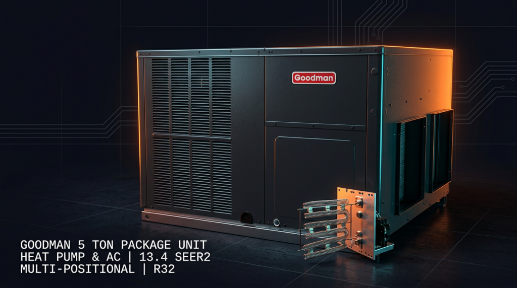 The Goodman 5 Ton Package Unit Heat Pump with 13.4 SEER2 rating combines heating and cooling in one multi-positional unit, making it ideal for retrofit installations and new construction where space is limited. This R32-based system delivers efficient year-round climate control without requiring separate indoor and outdoor equipment. The GPHM36031 is built for contractors and homeowners who need a complete heating and cooling solution with flexible installation options.