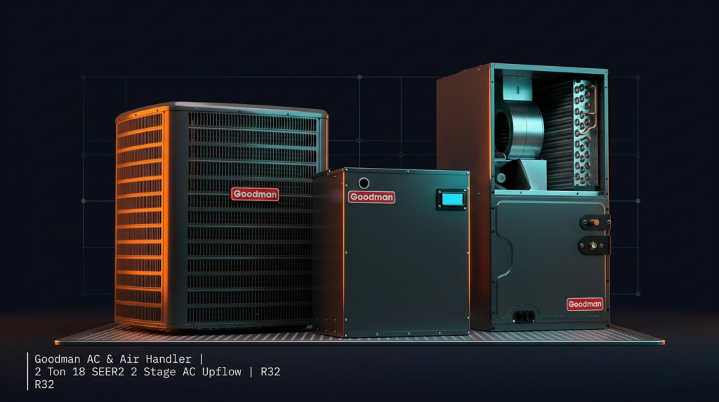 The Goodman 2 Ton 18 SEER2 Two-Stage AC and Air Handler with R32 refrigerant delivers high-efficiency cooling with advanced diagnostics and smartphone control. This system combines a two-stage Copeland Ultra-Tech scroll compressor condenser with a variable-speed ECM air handler, designed for homeowners and contractors seeking reliable cooling performance with modern smart capabilities.