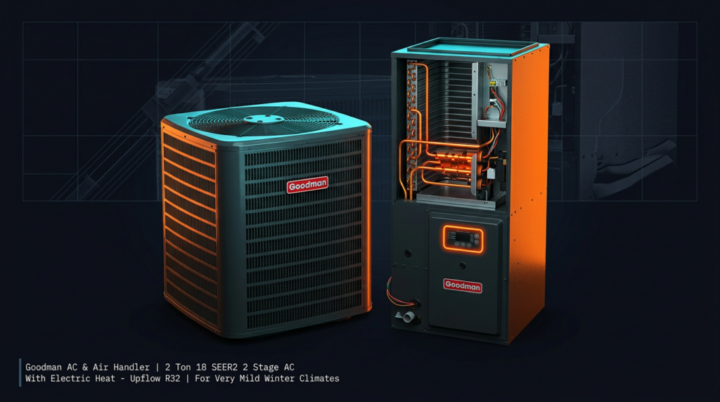 The Goodman 2 Ton 18 SEER2 AC with electric heat is a high-efficiency cooling and heating solution designed for mild winter climates where supplemental electric heat meets seasonal demands. This two-stage system pairs a Copeland Ultra-Tech scroll compressor with an integrated ComfortBridge communicating platform, delivering reliable performance and smart diagnostics for HVAC contractors and homeowners seeking dependable efficiency.
