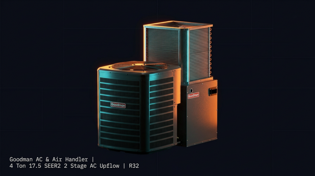 The Goodman 4 Ton 17.5 SEER2 Two-Stage AC with R32 refrigerant delivers high-efficiency cooling for residential applications. This upflow system pairs a GLXT7C condenser with an MBVB air handler, offering two-stage cooling and variable-speed blower control for improved comfort and energy savings. Built-in smart diagnostics and Bluetooth connectivity streamline installation and troubleshooting.