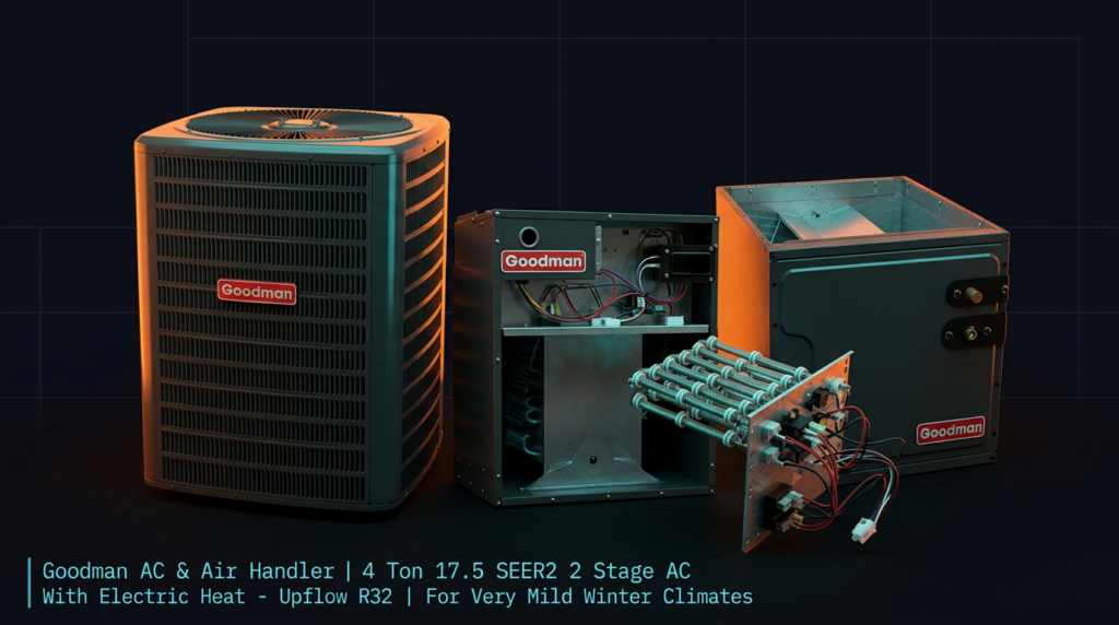 The Goodman 4 Ton 17.5 SEER2 Two-Stage AC with Electric Heat is a complete cooling and heating solution designed for mild winter climates where supplemental electric resistance heat meets seasonal demand. This system pairs a high-efficiency R32 condenser with a variable-speed air handler, delivering consistent comfort while reducing energy consumption. Ideal for homeowners seeking reliable performance without the complexity of heat pump operation in warmer regions.