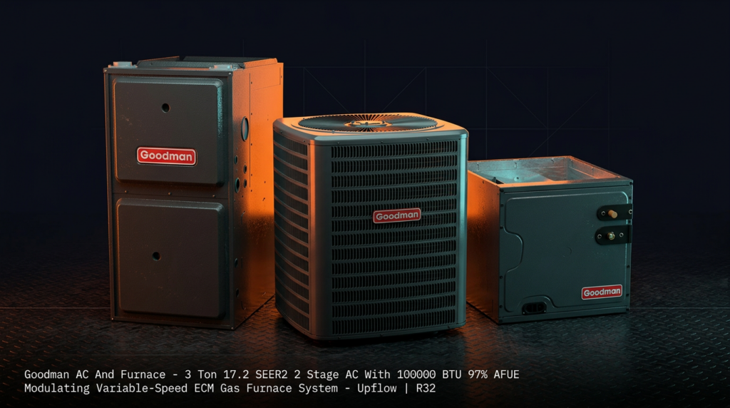 Goodman AC And Furnace – 3 Ton 17.2 SEER2 2 Stage AC With 100000 BTU 97% AFUE Modulating Variable-Speed ECM Gas Furnace System – Upflow | R32