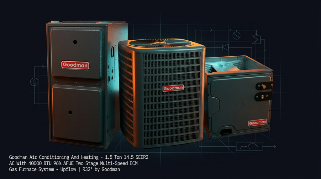 The Goodman 1.5 Ton 14.5 SEER2 AC with 40000 BTU 96% AFUE Two Stage Multi-Speed ECM Gas Furnace System delivers efficient cooling and heating in a single upflow unit using R32 refrigerant. This complete system is designed for homeowners and contractors seeking reliable performance with lower operating costs. The combination of a high-efficiency scroll compressor and two-stage gas furnace with ECM blower motor reduces energy consumption while maintaining consistent comfort.