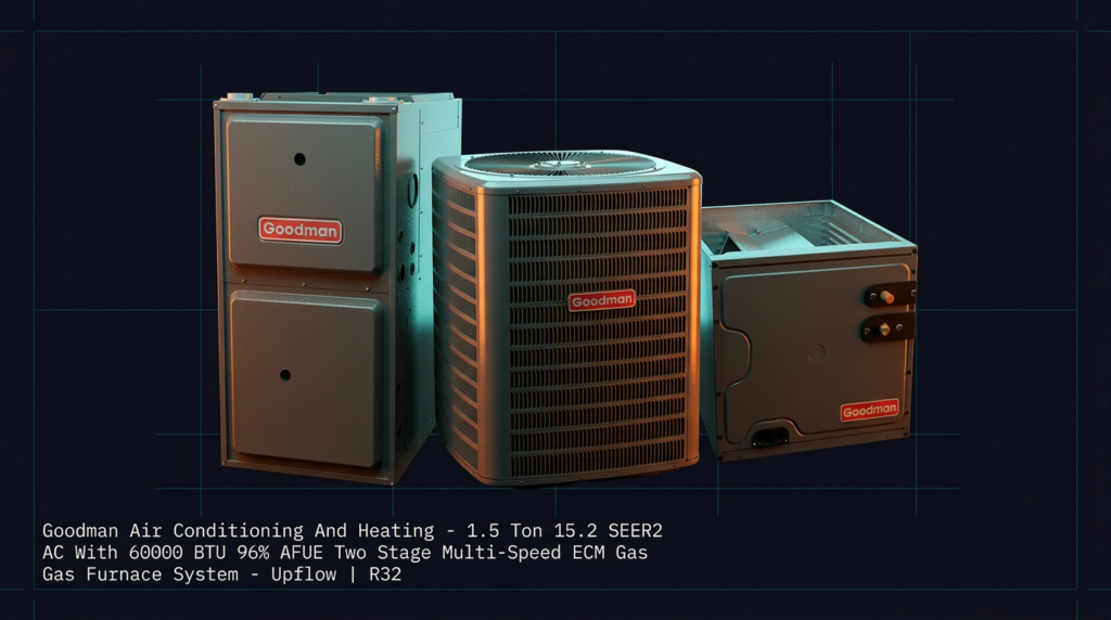Goodman Air Conditioning And Heating – 1.5 Ton 15.2 SEER2 AC With 60000 BTU 96% AFUE Two Stage Multi-Speed ECM Gas Furnace System – Upflow | R32