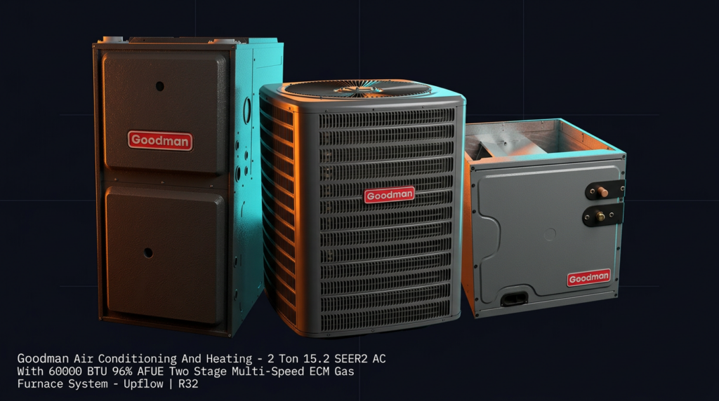 The Goodman 2 Ton 15.2 SEER2 AC with 60000 BTU 96% AFUE Two Stage Gas Furnace System delivers high-efficiency cooling and heating in a single packaged solution. This R32-charged unit is designed for upflow installation and suits homeowners seeking reliable comfort with lower operating costs. The combination of a scroll compressor condenser and two-stage furnace with ECM blower motor provides quiet, economical operation year-round.