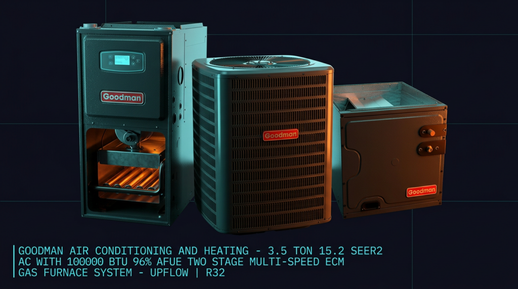 The Goodman 3.5 Ton 15.2 SEER2 AC with 100,000 BTU 96% AFUE Two Stage Multi-Speed ECM Gas Furnace System delivers high-efficiency heating and cooling in a single upflow unit using R32 refrigerant. This system is designed for homeowners seeking reliable performance with lower operating costs and reduced environmental impact. The combination of a high-efficiency scroll compressor and two-stage gas furnace makes this an effective choice for year-round comfort.
