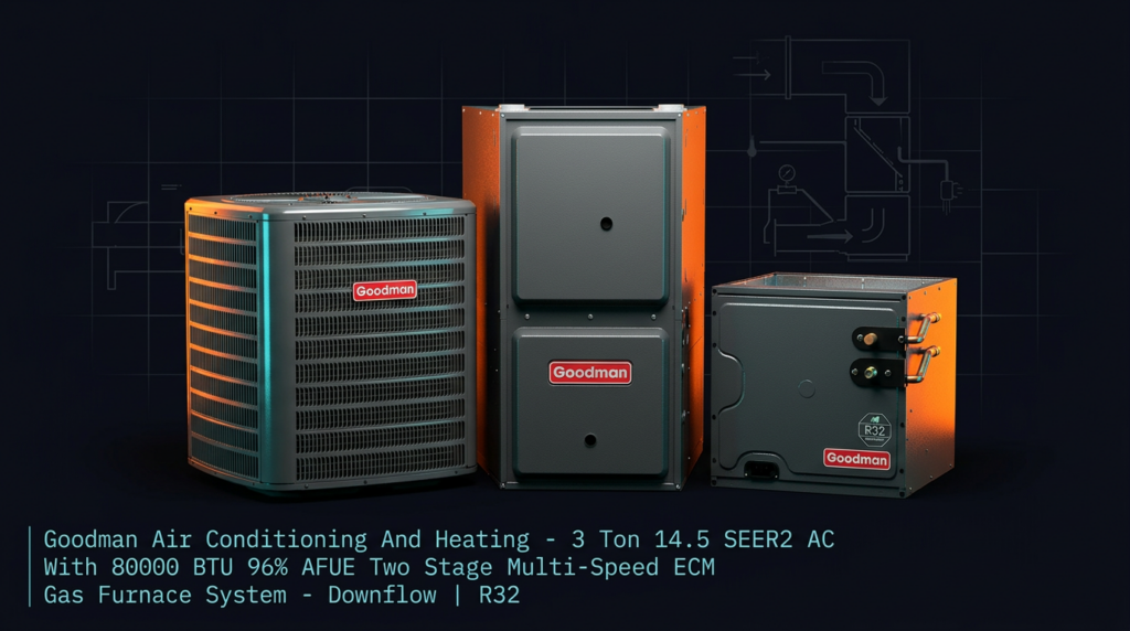 Goodman Air Conditioning And Heating – 3 Ton 14.5 SEER2 AC With 80000 BTU 96% AFUE Two Stage Multi-Speed ECM Gas Furnace System – Downflow | R32