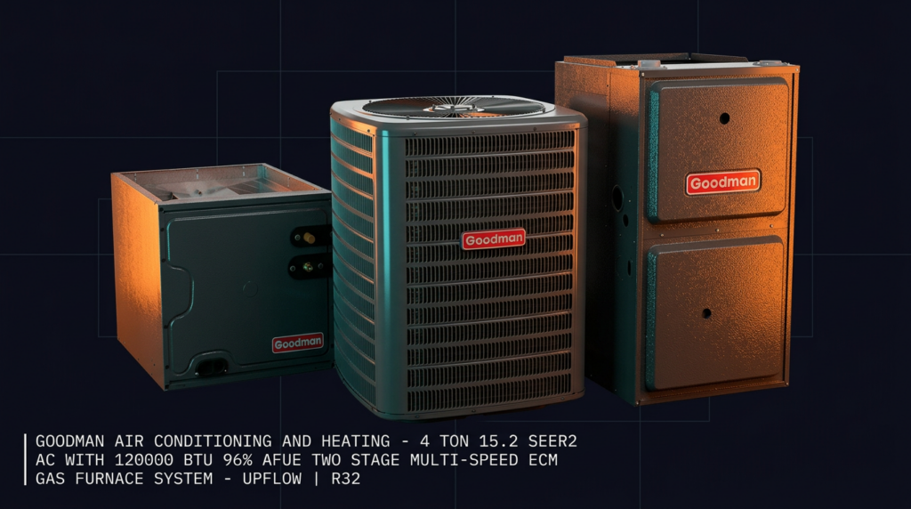 The Goodman 4 Ton 15.2 SEER2 AC with 120,000 BTU 96% AFUE Two Stage Gas Furnace System delivers efficient cooling and heating in a single matched unit. This R32 system combines a high-efficiency scroll compressor condenser with a multi-speed ECM furnace, making it suitable for homeowners seeking reliable performance and lower operating costs. The upflow configuration works in standard residential installations where ductwork runs vertically.