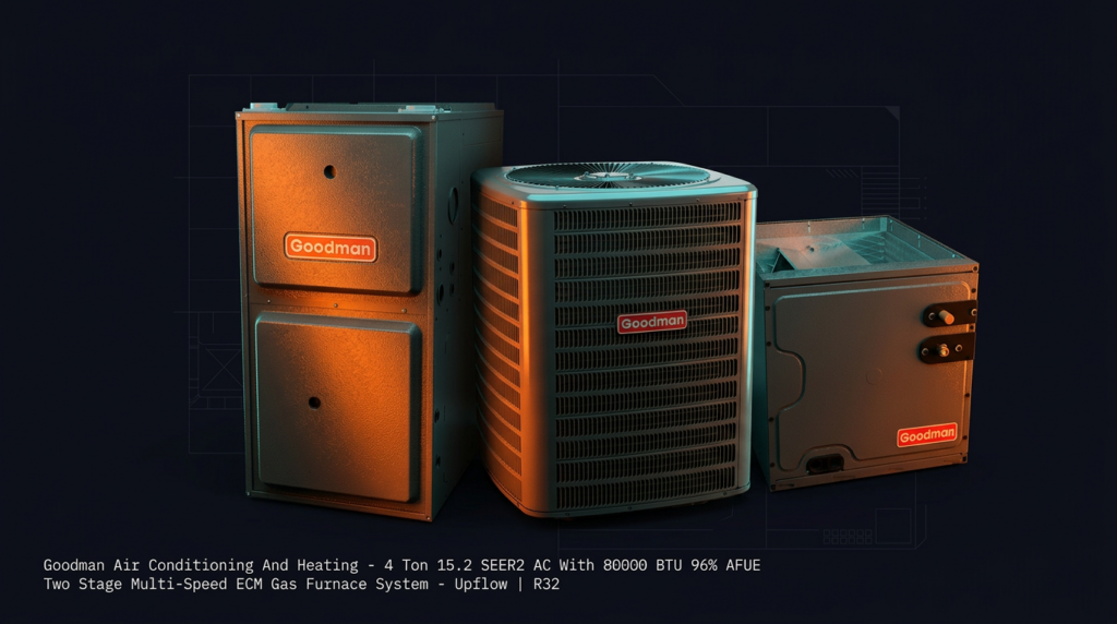 Goodman Air Conditioning And Heating – 4 Ton 15.2 SEER2 AC With 80000 BTU 96% AFUE Two Stage Multi-Speed ECM Gas Furnace System – Upflow | R32