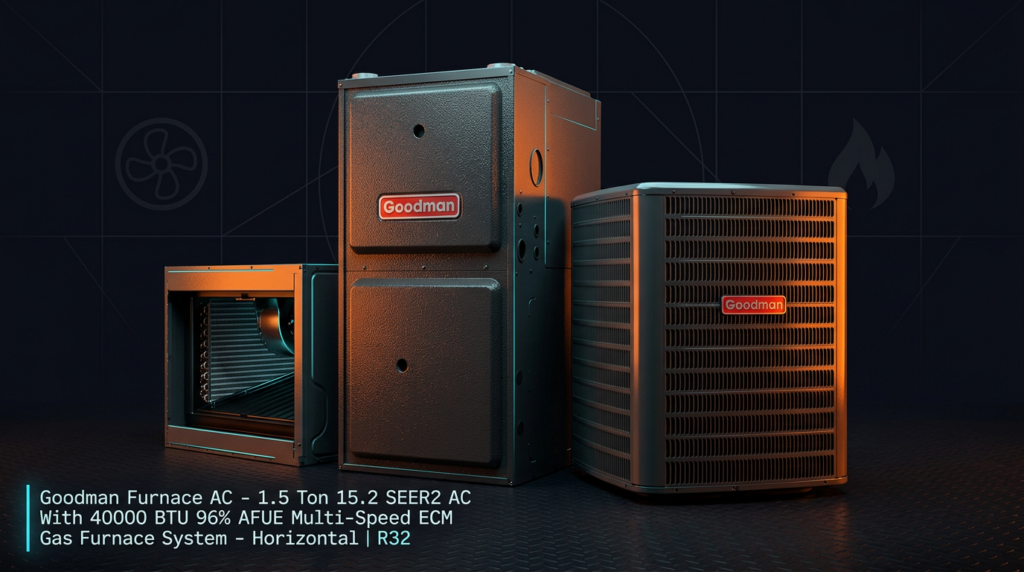 The Goodman 1.5 Ton 15.2 SEER2 AC with 40,000 BTU 96% AFUE gas furnace is a complete heating and cooling system designed for homeowners seeking efficient year-round climate control. This horizontal configuration pairs a high-efficiency scroll compressor condenser with a multi-speed ECM furnace to deliver reliable performance in R32 refrigerant. The system combines advanced cooling technology with a durable heat exchanger for dependable operation across seasons.