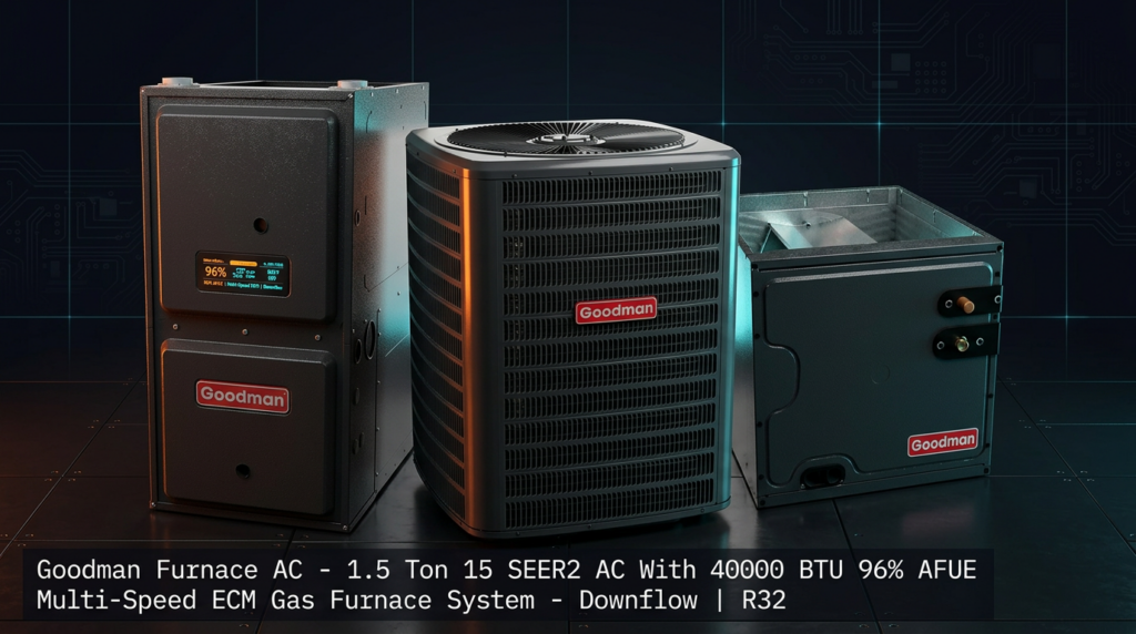 The Goodman 1.5 Ton 15 SEER2 AC with 40000 BTU 96% AFUE Gas Furnace System delivers efficient cooling and heating in a single downflow unit using R32 refrigerant. This combination system pairs a high-efficiency scroll compressor condenser with a multi-speed ECM gas furnace, making it suitable for homeowners seeking both air conditioning and heating from one installation. The 96% AFUE rating and 15 SEER2 efficiency standard reduce energy consumption and operating costs year-round.