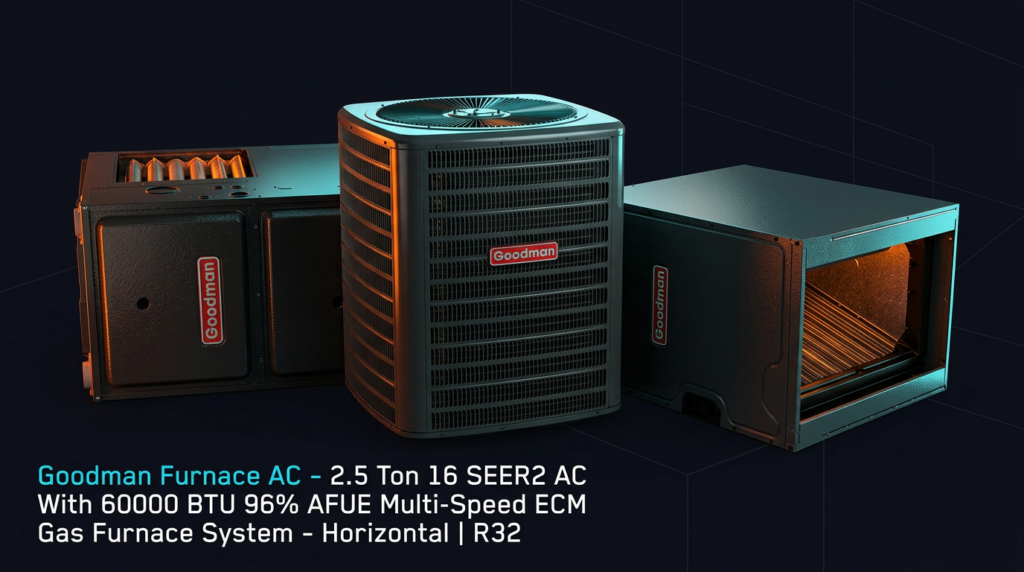 The Goodman 2.5 Ton 16 SEER2 AC system with 60,000 BTU 96% AFUE gas furnace delivers efficient heating and cooling in a single horizontal unit. This R32 refrigerant system combines a high-efficiency scroll compressor condenser with a multi-speed ECM gas furnace, making it ideal for homeowners seeking reliable performance and lower operating costs. The 96% AFUE rating and 16 SEER2 efficiency ensure substantial energy savings year-round.