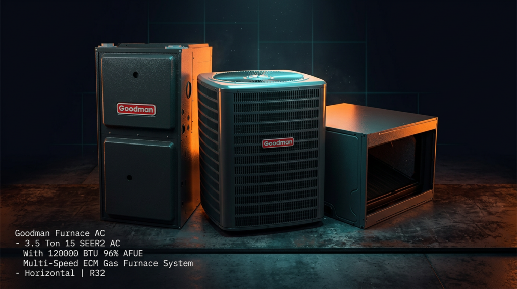 The Goodman Furnace AC 3.5 Ton 15 SEER2 system delivers efficient heating and cooling in one complete package, combining a high-efficiency scroll compressor condenser with a 96% AFUE multi-speed ECM gas furnace. This R32 refrigerant system is designed for homeowners and contractors seeking reliable performance with lower operating costs and reduced environmental impact.