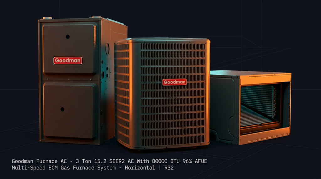 The Goodman Furnace AC 3 Ton 15.2 SEER2 system pairs a high-efficiency scroll compressor condenser with an 80,000 BTU 96% AFUE gas furnace for complete home heating and cooling. This R32 refrigerant system is designed for HVAC professionals and homeowners seeking reliable performance with strong efficiency ratings and dependable operation in a horizontal configuration.