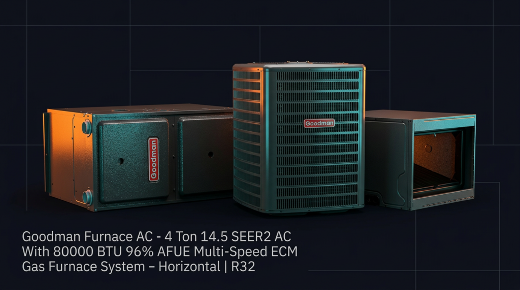 The Goodman 4 Ton 14.5 SEER2 AC with 80,000 BTU 96% AFUE Gas Furnace System delivers efficient heating and cooling in a single matched unit. This horizontal configuration combines a high-efficiency scroll compressor condenser with a multi-speed ECM gas furnace, making it suitable for homeowners seeking reliable year-round comfort. R32 refrigerant operation meets current environmental standards while maintaining strong seasonal efficiency ratings.