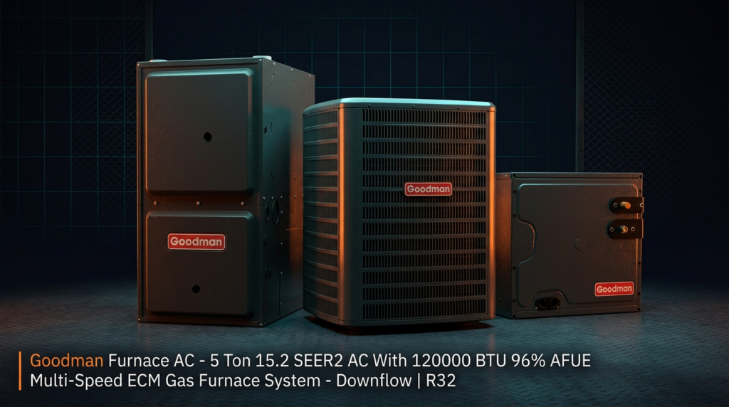 The Goodman 5 Ton 15.2 SEER2 AC with 120,000 BTU 96% AFUE Gas Furnace System combines high-efficiency cooling and heating in a single downflow package. This R32 system is designed for contractors and homeowners seeking dependable performance with solid efficiency ratings. The package pairs a scroll compressor condenser with a multi-speed ECM furnace for balanced comfort and operating cost control.