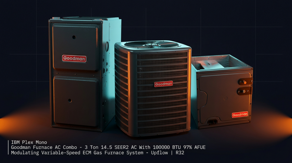 Goodman Furnace AC Combo – 3 Ton 14.5 SEER2 AC With 100000 BTU 97% AFUE Modulating Variable-Speed ECM Gas Furnace System – Upflow | R32