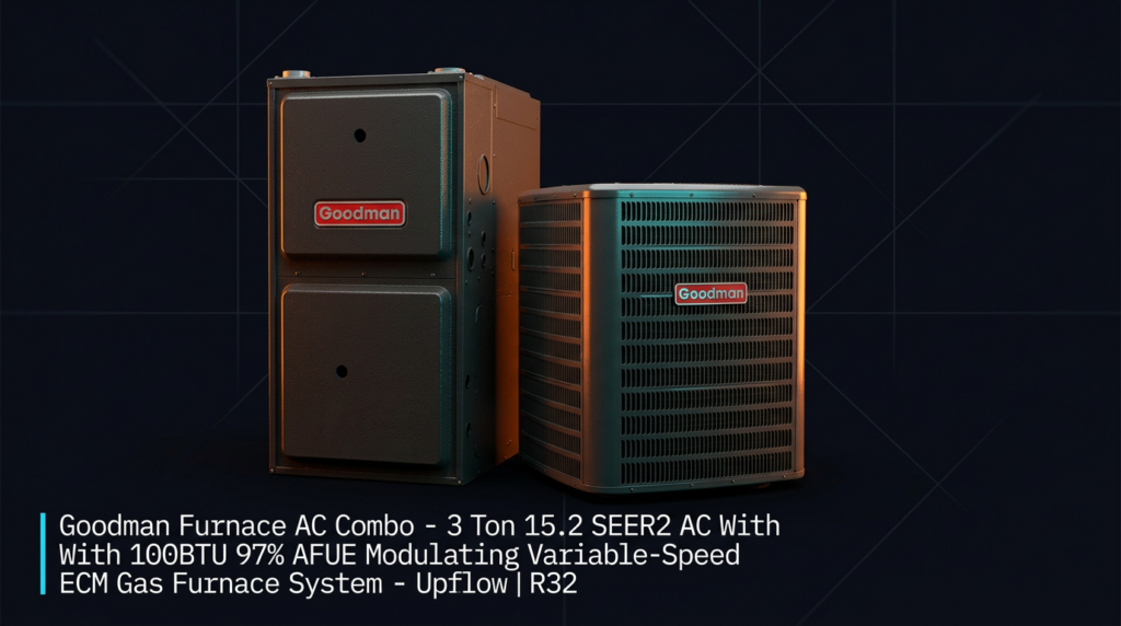 The Goodman Furnace AC Combo delivers efficient heating and cooling in a single system with 3-ton cooling capacity and 100,000 BTU heating output. This R32 unit pairs a high-efficiency air conditioner rated up to 15.2 SEER2 with a 97% AFUE modulating gas furnace, making it ideal for homeowners seeking reliable performance and lower energy costs. The system includes variable-speed ECM technology and factory commissioning via Bluetooth diagnostics.