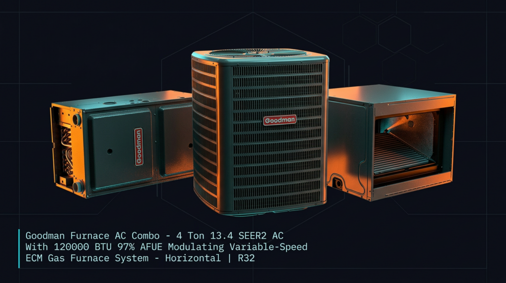 The Goodman 4 Ton 13.4 SEER2 AC with 120,000 BTU 97% AFUE Modulating Gas Furnace is a complete heating and cooling system designed for residential applications requiring efficient year-round climate control. This horizontal configuration pairs an R32 high-efficiency air conditioner with a variable-speed gas furnace, making it ideal for homeowners seeking lower energy bills and reliable performance.
