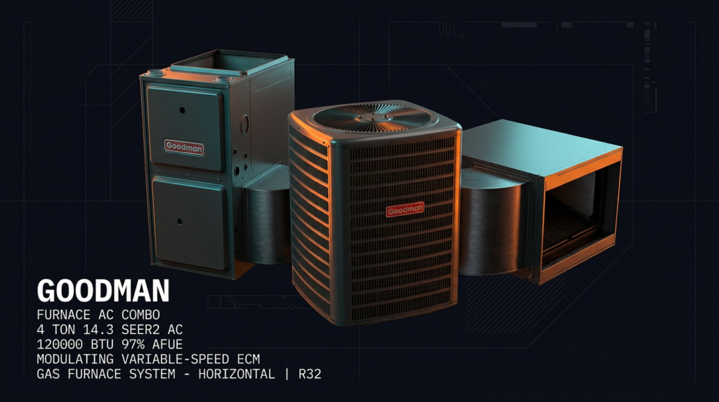 The Goodman 4 Ton 14.3 SEER2 AC with 120000 BTU 97% AFUE modulating gas furnace delivers high-efficiency heating and cooling in a single system. This R32 combo unit is ideal for homeowners seeking energy-efficient climate control with advanced variable-speed technology. The modulating furnace and high-efficiency compressor reduce energy consumption while maintaining consistent comfort.