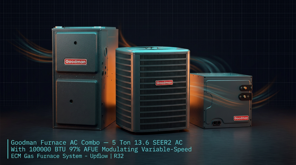 Goodman Furnace AC Combo – 5 Ton 13.6 SEER2 AC With 100000 BTU 97% AFUE Modulating Variable-Speed ECM Gas Furnace System – Upflow | R32