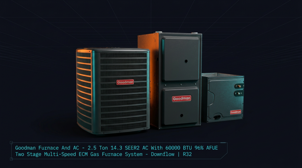 Goodman Furnace And AC – 2.5 Ton 14.3 SEER2 AC With 60000 BTU 96% AFUE Two Stage Multi-Speed ECM Gas Furnace System – Downflow | R32