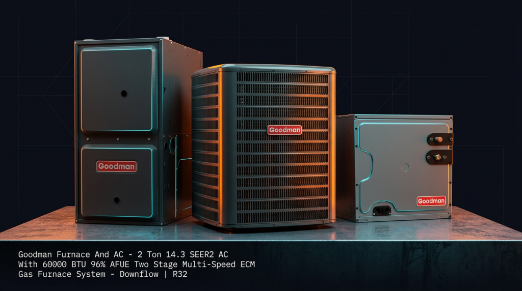 The Goodman 2 Ton 14.3 SEER2 AC with 60000 BTU 96% AFUE Two Stage Gas Furnace is a complete heating and cooling system designed for homeowners seeking high-efficiency climate control in a downflow configuration. This R32-compatible system pairs an energy-efficient air conditioner with a multi-speed ECM furnace to deliver reliable performance across seasons. The combination of advanced compressor technology and a two-stage gas valve provides both cooling efficiency and economical heating.
