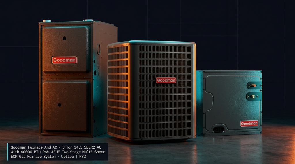 Goodman Furnace And AC – 3 Ton 14.5 SEER2 AC With 60000 BTU 96% AFUE Two Stage Multi-Speed ECM Gas Furnace System – Upflow | R32
